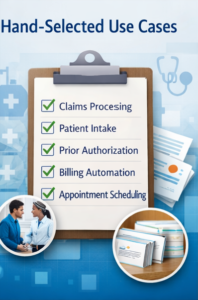use cases carefully chosen for their relevance, feasibility, and impact within healthcare operations. These use cases are based on recurring pain points observed across the industry—such as claims processing, patient intake, and prior authorization—and are vetted to ensure they deliver measurable value early in the automation journey. This curated approach reduces the burden of discovery and helps teams focus on implementation and outcomes from day one.
